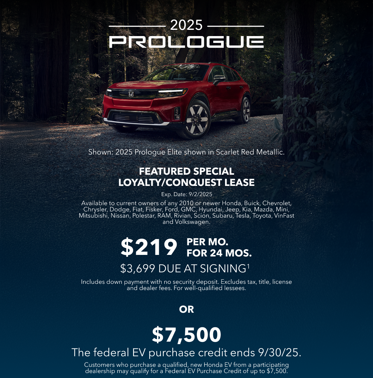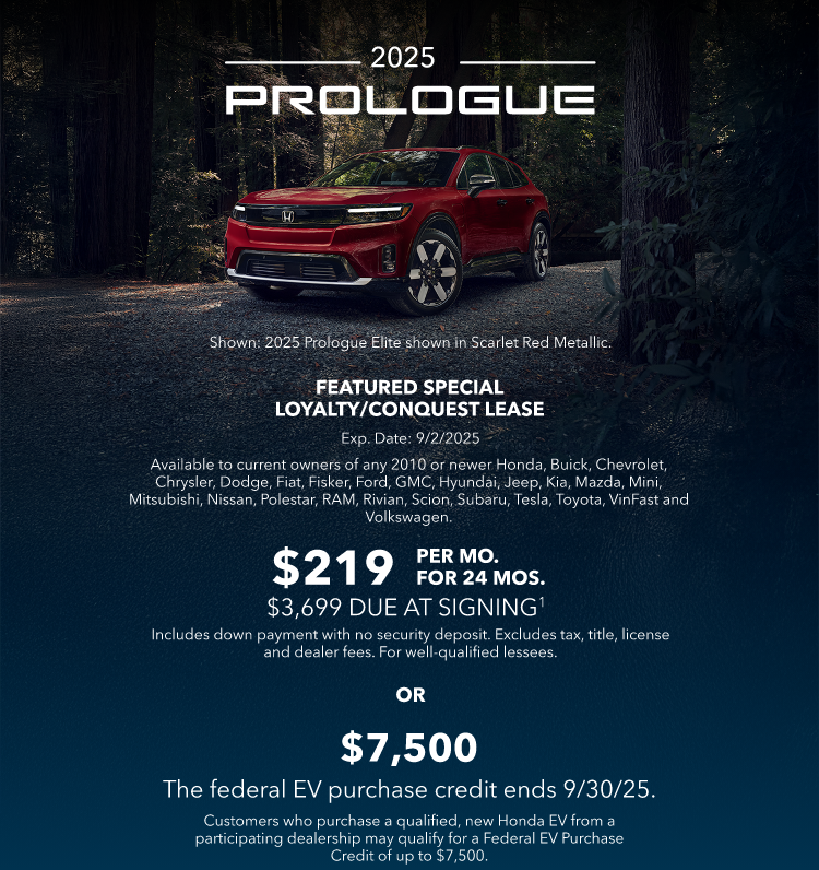 | View in browser |  | | | Efficient. Elevated. Electrifying. | | In addition to a 308-mile EPA range rating,2 Prologue owners have access to the largest public fast-charging networks. | | | | | SHOPPING TOOLS |  | |  | | | 1 Excludes residents of CA, CO, CT, DC, DE, FL, MA, MD, ME, MN, NH, NJ, NM, NV, NY, OR, PA, RI, VA, VT, WA, WV. Offer excludes accessories and premium paint color. Closed-end lease for 2025 Prologue AWD EX available through 9/2/2025, to approved lessees or purchasers by Honda Financial Services in select states. Lease or Finance offer only available to current qualified owners of any 2010 or newer Honda and competitive brands listed above. MSRP $51,850.00 (includes destination; excludes tax, title, license, registration, options, insurance). Actual net capitalized cost $29,900.98. Total monthly payments $5,256.00. Option to purchase at lease end $26,443.50. Monthly payment/total due at lease signing calculated with $3,500.00 LOYALTY or CONQUEST AWARD AMOUNT and $7,500 Clean Vehicle Credit toward cap cost reduction or down payment assistance. Lessee responsible for maintenance, excessive wear/tear and up to 20¢/mi. over 10,000 miles/year. Offer cannot be combined with $0 Due at Lease Signing or Certified Pre-Owned Financing. Conquest & Loyalty offers cannot be combined. Dealer participation may affect actual payment. Dealer sets actual prices. See participating dealers for complete details.